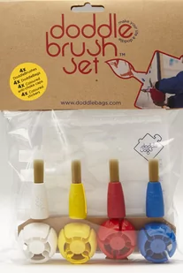 - 4 saszetki wielorazowe - 4 różnokolorowe bezpieczne zakrętki - 4 różnokolorowe naklejki na saszetki - 4 przykręcane pędzelki
