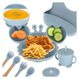 PIERWSZE NACZYNIA SILIKONOWE DLA DZIECI ZESTEAW 9 SZTUK KRAB NIEBIESKI ⭐⭐⭐⭐⭐ ✔️ Silikonowe naczynia z przyssawkami i śliniakiem ✔️ Aż 9 elementów do nauki samodzielnego jedzenia ✔️ Bezpieczny silikon wolny od BPA, można myć w zmywarce ✅Parametry techniczne: Wiek: 6 msc + Kolor: niebieski Tworzywo: silikon (wolny od BPA), drewno ✅Wymiary: Talerzyk krab: