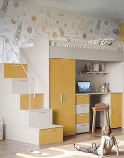 - łóżko piętrowe (na górze) ze stelażem i materacem,- biurko z szufladami i szafką (w centralnej części),- pojemną szafę ubraniową,- praktyczne schody z szufladami w stopniachObciążenie górnego łóżka wynosi do 75 kg.