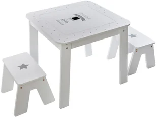 Stolik z dwoma taboretami to doskonały element wyposażenia pokoju dziecięcego! Twój maluch uwielbia spędzać czas na rozwijających, kreatywnych zabawach$95 Umieść w jego pokoju stolik, przy którym usiądzie na dołączonym do zestawu taborecie, a następnie będzie mógł rysować, malować lub wykonywać prace plastyczne innymi technikami. Ten wyjątkowy mebel posiada zdejmowany blat, który po odwróceniu zamienia się w tablicę do pisania kredą, a w jego wnętrzu znajduje się praktyczny schowek na przybory piśmiennicze. Stolik w uniwersalnym, białym kolorze został wykonany z połączenia płyty MDF z solidnym drewnem. W skład zestawu wchodzą również dwa taborety, dzięki którym twoje dziecko będzie mogło bawić się wraz z zaproszonym przyjacielem. Zarówno blat stolika, jak i siedzisko taboretu pokryto dekoracyjnym wzorem szarych gwiazdek.