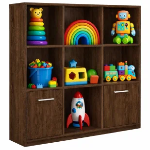 To funkcjonalny regał na zabawki, który łączy nowoczesny design z codzienną wygodą użytkowania. Oto wypunktowane zalety regału marki Edinos Premium: Prosta i klasyczna forma regału pasuje do wielu różnych stylów wnętrz, dodając elegancji i funkcjonalności. Regał wykonany jest z wysokiej jakości płyty meblowej, co gwarantuje jego wytrzymałość i trwałość. Oferuje 7 otwartych kubików i 2 drzwi, co zapewnia mnóstwo miejsca do przechowywania książek, czasopism, płyt DVD i innych przedmiotów dekoracyjnych.