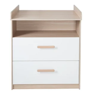 Nowoczesny i funkcjonalny przewijak ma ponadczasowy design, który łączy w sobie wysokiej jakości dekor dębu, eleganckie białe szuflady i drewniane uchwyty. Dzięki możliwości demontażu przewijaka, komoda jest wszechstronnym elementem, z którego można korzystać nawet po okresie pieluszek. Komoda ma dużą otwartą komorę i dwie przestronne szuflady z pełnym wysuwem dla łatwego dostępu do przechowywanych ubrań. Komoda została wyprodukowana w Niemczech zgodnie z normami bezpieczeństwa dla produktów do pielęgnacji dzieci. Wymiary komody: