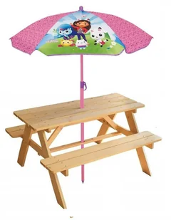 KOCI DOMEK GABI ZESTAW OGRODOWY PIKNIKOWY DZIECI STOLIK ŁAWECZKA DREWNIANY Drewniany zestaw ogrodowy z dwiema ławeczkami, stołem oraz parasolem KOCI DOMEK GABI. Doskonale sprawdzi się podczas przyjęć oraz zabaw na świeżym powietrzu. Ochrona przed słońcem: dołączony do zestawu parasol chroni dzieci przed szkodliwym promieniowaniem UV. Komplet zapewnia bezpieczne miejsce do zabawy, jedzenia i relaksu.