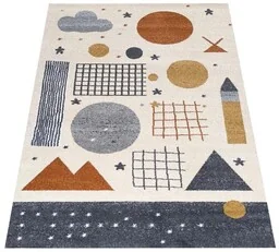 Dywan wielokolorowy, dziecięcy Lovi Lumi 01 Dziecięcy dywan z nowoczesnymi, geometrycznymi wzorami na jasnym tle. Przyjazny design łączy estetykę z funkcjonalnością, idealny do pokoju dziecięcego, wprowadzając ciepło i zachęcając do zabawy. Kraj pochodzenia: Turcja Skład runa: 100% polipropylen Wys.