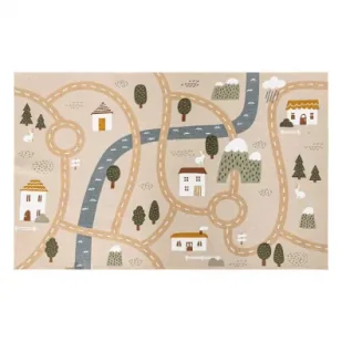 Dywan dziecięcy z motywem miasteczka to nie tylko funkcjonalny element wyposażenia pokoju, ale także przestrzeń do kreatywnej zabawy. Wykonany z trwałego i łatwego do czyszczenia materiału, świetnie sprawdzi się w codziennym użytkowaniu. Oryginalny wzór przedstawiający drogi, domki, drzewa i zwierzątka w stonowanych kolorach beżu, zieleni i brązu doskonale komponuje się z różnorodnymi aranżacjami wnętrz. Antypoślizgowy spód zapewnia bezpieczeństwo podczas zabawy, a miękka struktura dywanu dodaje przytulności każdemu pomieszczeniu. Idealny do pokoju dziecka, żłobka lub przedszkola.