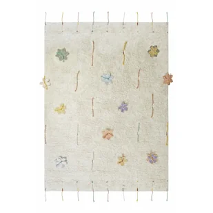 Ze względu na swój wesoły design dywan marki Lorena Canals jest praktycznym i designerskim dodatkiem odpowiednim do każdego pokoju dziecięcego. Wykonany jest z miękkiej mieszanki bawełny w odcieniach naturalnych i kości słoniowej, z kolorowymi sznurkami wyhaftowanymi na krawędziach, które służą jako frędzle, ale także rozłożone na całej powierzchni w symetryczny wzór. Dywan zawiera interaktywny zestaw czternastu bawełnianych płóciennych kwiatów , które można łatwo przywiązać do dywanu za pomocą kolorowych sznurków. W ten sposób służy nie tylko jako estetyczny dodatek, ale także jako środek do rozwijania kreatywności i percepcji sensorycznej dzieci.