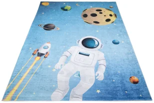 Dywany posiadają właściwości antyalergiczne. Planety, gwiazdy, rakiety, kosmonauci to motywy na dywanach , w których twój mały odkrywca kosmosu z pewnością się zakocha! Dane techniczne: Skład: 100% poliester Wysokość runa: 6 mm Waga/m2: 900 g Kształt: