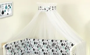 Wymiary baldachimu to 160 cm wysokości oraz 600 cm szerokości. Taka wielkość baldachimu pozwala na całkowite zasłonięcie łóżeczka w rozmiarze 120/60, 140/70 oraz kołyski, niezależnie od miejsca mocowania stelaża. Baldachim wykonany jest z białego tiulu, dzięki czemu jest przewiewny i nie zabiera światła. Spełnia podwójną funkcję; estetyczno-ozdobną oraz funkcjonalną. Stanowi piękne wykończenie łóżeczka oraz nadaje niepowtarzalny, uroczy klimat pokoikowi dziecięcemu. Walory praktyczne baldachimu to możliwość zastosowania go jako moskitiery. Przy pełnym przysłonięciu baldachimem łóżeczka i dzięki dodatkowemu zabezpieczeniu w szczycie baldachimu, natrętne owady nie mają możliwości przedostania się i dokuczania naszemu maluszkowi. Całość baldachimu uwieńczona jest pieknę ozdobą nawiązującą do kolekcji, w postaci ozdobnej szarfy. W połączeniu z innymi elementami w obrębie tej samej kolekcji, stanowi wyjatkową, niepowtarzalną całość. W sytuacji, kiedy dzielimy swoja sypialnię z naszym skarbem, taki baldachim pozwoli na odrobinę własnej przestrzeni maluszkowi i odrobinę intymności rodzicom.