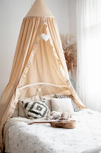 Baldachim wiszący z falbanką- BEŻ Baldachim wiszący to piękny dodatek do pokoju dziecięcego. Służyć może jako niepowtarzalna dekoracja łóżeczka dziecięcego. Może także pełnić rolę przytulnego miejsca do zabawy. Powieszony nad łóżeczkiem dziecięcym osłoni przed nadmiarem światła oraz wytłumi hałasy, tworząc wewnątrz łóżeczka przytulne i bezpieczne miejsce do odpoczynku. Baldachim można łatwo zamontować do sufitu.