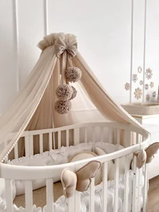 Delikatny baldachim, który jest montowany na stelażu. W przepięknych, najmodniejszych kolorach. Obszyty taśmą z pomponikami. W komplecie 4 pompony o średnicy ok 10cm, wykonane ręcznie, gęste. Baldachim na wysokie stelaże lub jeśli chcesz zawiesić w poprzek łóżeczka ma 180cm wysokości i powstaje z 9 metrów tiulu Stelaż przykręcany do łóżeczka jest w zestawie.