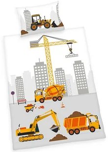 Wesołe przygody z wysokiej jakości pościelą wykonaną z tej najlepszej bawełny dla małych budowniczych i architektów. Spotkajmy się na budowie, na której nie może zabraknąć dźwigu, betoniarki, koparki czy ciężarówki. Pomarańczowe auta na biało-szarym tle tworzą na jednej stronie poszwy na kołderkę duży obrazek, na drugiej stronie znajdują auta w pomniejszeniu. Poszewka na poduszkę posiada z każdej strony inny motyw. Włókno bawełniane w wykończeniu renforcé jest dzięki procesowi technologicznemu znacznie trwalsze, ale równocześnie bardziej gładkie i miękkie w dotyku.