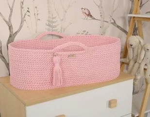Kosz wykonany jest ręcznie ze sznurka bawełnianego. Miękkie wygodne pierwsze łóżeczko dla noworodka. Dzięki niewielkim wymiarom kosz Mojżesza może towarzyszyć rodzicom w każdym pokoju. Bawełniany sznurek z którego wypleciony jest kosz jest miękki, delikatny, a równocześnie bardzo stabilny. Ścieg szydełkowy wykorzystany w koszu jest lekko ażurowy, dzięki czemu zapewniona jest odpowiednia cyrkulacja powietrza. Dzięki uchwytom kosz Mojżesza można w łatwy sposób przenosić i mieć malucha zawsze blisko siebie.