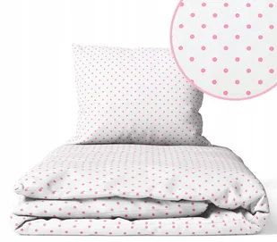 Komplet pościeli 2 elementowy Wzór: Kropeczki Różowe Poszewka na kołderkę - 135x100cm Poszewka na poduszkę - 60x40cm Zapinana na bezpieczny zamek Posiada moc...
