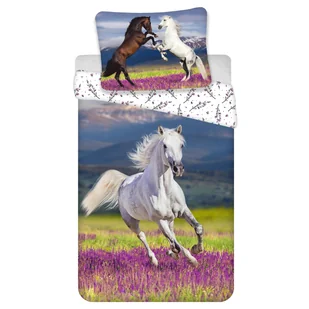 POŚCIEL 140x200 BAWEŁNIANA BIAŁA Z KOŃMI I DELIKATNYM KWIATOWYM DESENIEM Naturalna pościel z 100% bawełny dla miłośników koni i subtelnych, botanicznych wzorów. Na froncie poszwy galopuje majestatyczny koń na tle fioletowej łąki, a rewers zdobi drobny, biały motyw z gałązkami i kwiatuszkami, dzięki czemu komplet wygląda świetnie po obu stronach. Poszewka prezentuje dynamiczną scenę z dwoma końmi, co dopełnia spójny, „sielski” charakter zestawu. 100% bawełna – miękka, gładka i przewiewna; przyjazna dla skóry przez cały rok, trwały nadruk – żywe kolory i ostre detale odporne na częste pranie, dwustronny efekt – z jednej strony konie, z drugiej drobny, kwiatowy deseń, wygodne zapięcie – poszwa i poszewka na zamek błyskawiczny, łatwa pielęgnacja – zalecane pranie w 40°C. Zawartość kompletu: