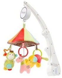 Karuzela z pozytywką z kolekcji: Safari. Urocza małpka, dwie figlarne żyrafy i dwa zadumane kolorowe słonie zabiorą Twojego maluszka do krainy snów. Mechaniczna pozytywka z włącznikiem/wyłącznikiem/ pozwala postaciom tańczyć i łagodnie uspokajać w rytmie popularnej kołysanki. W ciągu dnia bezpieczne lusterko i tańczące postacie budzą ciekawość i zapraszają do słuchania, oglądania i podziwiania. Delikatne kolory i różnorodne powierzchnie stymulują percepcję dziecka.