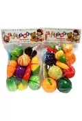 Zestaw plastikowych warzyw lub owoców wraz z nożem, talerzem i deską. Wśród owoców można znaleźć m. in. banana, arbuza, pomarańcze, truskawkę i winogrono natomiast wśród warzyw kukurydzę, paprykę, bakłażana, cebulę, brokuła, kapustę pekińską. Towar dostępny w kilku wersjach,. . .