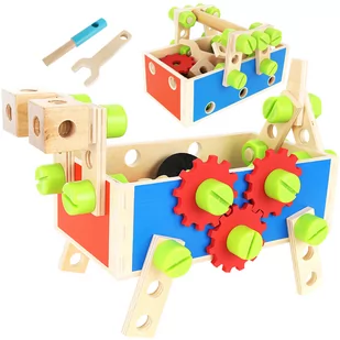 - 2w1 - jedna zabawka posiada 2 zastosowania. Łączy w sobie skrzynkę do przechowywania narzędzi oraz obiekt do stworzenia różnych konstrukcji. Dziecko może zbudować samochód, dźwig, robota i wiele innych wymyślonych przez dziecko projektów.