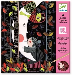 Dobranoc! Zestaw czterech wydrapywanek z nocnymi pejzażami do odkrywania i kreatywnego spędzania czasu. Po wydrapaniu zaznaczonych obszarów specjalnym rysikiem odkryjecie zachwycające, kolorowe obrazki. Wiek: 6+ Design: Nathalie Minne W zestawie: 4 karty do wydrapywania, drewniany rysik, instrukcja Wymiary pudełka: 20 cm x 20 cm Każdego dnia w Paryżu zespół projektantów oraz ilustratorów pracuje tworząc wyjątkowe przedmioty, które wzbogacają dziecięcą wyobraźnię poprzez zabawę.