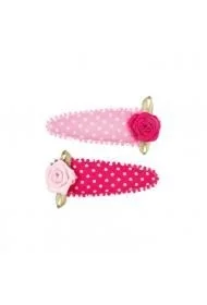 Komplet dwóch spinek do włosów z różyczkami Shanne holenderskiej marki Souza!Cechy: obciągnięte różową tkaniną w groszkizdobione różyczkami metalowe zaciski na klikozdoby stabilnie trzymają się włosówidealne zarówno na przyjęcia, jak i na co dzieńnadają się także na prezentwiek: 3+skład: poliester, metaldesign: Holandiadługość spinki: 5 cmwymiary opakowania: