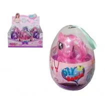Uroczy konik w jajku. W zestawie także grzebień do czesania grzywy konia oraz kolorowe koraliki z których dzieci będą mogły zrobić swoją pierwszą biżuterię. Produkt występuje w kilku wersjach kolorystycznych, wybierany losowo. Cena dotyczy jednej sztuki. Produkt dla dzieci od 6 lat.