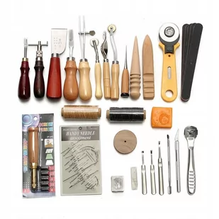 Wyjątkowy zestaw kaletniczy 37 narzędzi Bardzo porządny zestaw dla wprawionych oraz dla początkujących kaletników. Idealny do pracy ze skórami, torebkami, paskami i wieloma innymi materiałami. Model: T28 37szt. Skórzane zestaw narzędzi rzemieślniczych Materiał: stal + drewno Długość liny woskowej: 50 metrów Kolor: