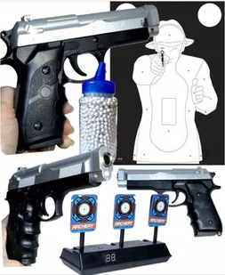 W zestawie: Pistolet na kulki rozmiar 6 mm Tarcza Tarcza elektroniczna Kulki 800 Dane techniczne: Materiał: kompozyt ABS Kolor: złoto-czarny Prędkość początk...