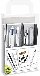 zawiera: długopis BIC 4 Colours Shine z nowoczesnym, metalicznym, srebrnym korpusie, długopis BIC Cristal Shine z metalicznym srebrnym korpusem, automatyczny długopis BIC M10 Shine, również w błyszczącym srebrze, długopis kulkowy BIC Roller Glide Pro o wyjątkowo cienkiej końcówce 0,7 mm dla precyzyjnego pisania, długopis żelowy BIC Cristal Gel zapewniający gładkie pisanie, marker permanentny BIC Marking ze srebrnym tuszem do personalizacji ulubionych rzeczy za pomocą charakterystycznego metalicznego efektu, ołówek automatyczny BIC Criterium zakończony gumką i wbudowaną temperówką, elegancki srebrny notatnik