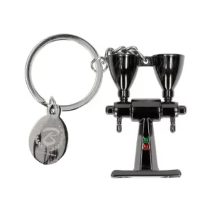 Brelok Barista Space w kształcie młynka do kawy, z dodatkową zawieszką z logo marki. Świetny ozdoba, brelok do kluczy lub pomysł na prezent dla miłośnika kawy.