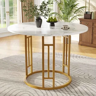 - Ten okrągły stół o wymiarach 80 x 80 x 76 cm charakteryzuje się praktycznym i funkcjonalnym designem, a jego duża powierzchnia robocza spełnia potrzeby wieloosobowych jadalni. Blat wykonany jest z grubej płyty MDF o strukturze imitującej marmur, odpornej na odkształcenia i charakteryzującej się wysoką nośnością (do 60 kg), dzięki czemu jest bezpieczny i trwały, chroniąc zdrowie całej rodziny. Powierzchnia stołu jest gładka i łatwa w czyszczeniu; wystarczy przetrzeć ją ściereczką, aby utrzymać ją w czystości, oszczędzając czas i wysiłek oraz sprawiając, że posiłki stają się przyjemniejsze.