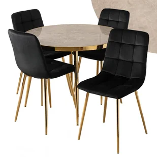 Zestaw stół okrągły Tinga i cztery krzesła York to propozycja dla osób, które cenią elegancję i nowoczesny styl w codziennym użytkowaniu. Okrągły stół o średnicy 100 cm wyposażony jest w solidny blat z hartowanego szkła w modnym, szarym marmurowym wykończeniu, który nie tylko zachwyca wizualnie, ale także cechuje się wysoką odpornością i łatwością w pielęgnacji. Stabilny korpus oraz nogi w złotym wykończeniu nadają całości prestiżowego charakteru, a wysokość stołu wynosząca 75 cm sprawia, że jest wygodny zarówno do codziennych posiłków, jak i rodzinnych spotkań. Zestaw uzupełniają krzesła York, zaprojektowane z myślą o komforcie i efektownym wyglądzie. Wysokość krzeseł to 90,5 cm, a szerokość i głębokość odpowiednio 43 i 52 cm, co zapewnia wygodę podczas użytkowania.