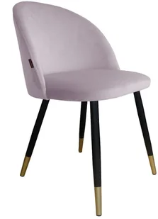 Krzesło CLAUDINE 1 VELVET GOLD nowoczesne do salonu Krzesło CLAUDINE 1 VELVET GOLD jasno różowe tapicerowane jest tkaniną aksamitną, która w zależności od ułożenia włosia oraz promieni słonecznych, pięknie połyskuje. Stabilna podstawa skłądająca się z czterech nóg, wykonana została z metalu malowanego proszkowo na kolor czarny ze złotymi zakończeniami nóg. Tkanina aksamitna wnosi do pomieszczenia odrobinę luksusu i elegancji. Krzesło doskonale sprawdzi się w jadalni i salonie w stylu glamour. Może być również idealnym dodatkiem w sypialni lub pokoju nastolatki.