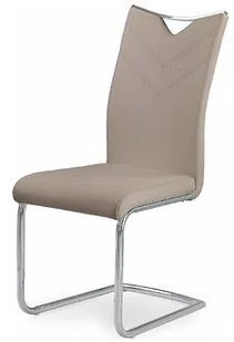 Nowoczesne krzesło K224 tapicerowane do salonu K224 to nowoczesne krzesło, które doskonale odnajdzie się jako krzesło do jadalni czy salonu. Krzesło tapicerowane jest ekoskórą w kolorze cappuccino. Krzesło K224 posiada także podstawę typu płoza utworzoną ze stali chromowanej, która wyróżnia się wytrzymałością i odpornością na uszkodzenia mechaniczne, zarysowania. Dodatkowo krzesło posiada metalową rączkę na oparciu, dzięki której bez problemu przesuniemy krzesło. Cechy produktu solidna podstawa wykonana ze stali chromowanej, komfortowe siedzisko i oparcie obite ekoskórą, podstawa typu płoza w kolorze chromu, stabilna konstrukcja pozwala na wieloletnie użytkowanie, metalowa rączka na oparciu, w swojej ofercie posiadamy szeroki wybór mebli pozwalających na kompleksowe wyposażenie mieszkania.