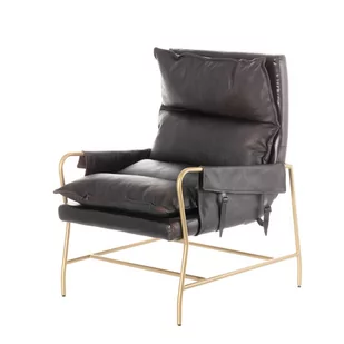 Designerski fotel ze skóry w kolorze czarnym. Nowoczesny fotel skórzany to kwintesencji stylu i elegancji. Wykonany z czarnej skóry bawolej, emanuje luksusem i wyrafinowaniem. Jego metalowa konstrukcja w kolorze złotym nadaje mu ekskluzywnego charakteru, co czyni go niezastąpionym elementem wyposażenia wnętrz w stylu industrialnym czy loft. Fotel Nitma to komfortowe miejsce do odpoczynku i ozdoba każdego wnętrza.