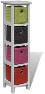 Ta trwała drewniana szafka w komplecie z czterema tkanymi koszami w różnych kolorach ma dużo miejsca do przechowywania cennych rzeczy. Drewniana rama ma solidny blat, na którym można umieścić przedmioty dekoracyjne.