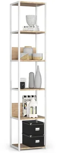 Materiał: najwyższej jakości metal pomalowany proszkowo metodą elektrostatyczną; naturalna płyta meblowa. Kolor: biały + dąb sonoma. Kliknij w link i sprawdź także inne regały do salonu w sklepie Edinos. pl. Produkt posiada certyfikat jakości "Edinos Standards DSI 804", który potwierdza najwyższą jakość wykonania mebla oraz pełny stopień zgodności poszczególnych jednostek wytworzonego wyrobu z przyjętym wzorcem. Poniżej znajduje się krótki 4-minutowy film producenta mebli Elior o polityce jakości firmy, gwarancji oraz odpowiedzialności społecznej marki.