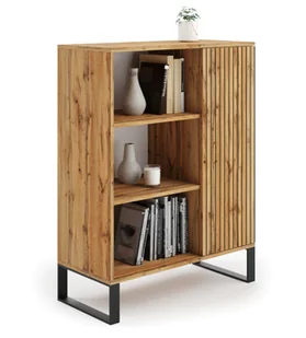 Szafka FONDI Szafka FONDI to niezwykle funkcjonalny mebel do Twojego salonu, który posiada prosty, a jednocześnie przyciągający wzrok wygląd inspirowany stylem loftowym. Przestrzenie półkowe są idealnym miejscem na ekspozycję zdjęć, książek oraz wielu innych ozdób. W szafce możesz przechowywać najróżniejsze przedmioty, dzięki czemu utrzymasz ład oraz porządek. Polecamy również inne meble z tej serii, które dostępne są na naszych pozostałych aukcjach WYKONANIE: front i korpus – płyta meblowa laminowana obustronnie o grubości 18 mm wszystkie krawędzie starannie oklejone obrzeżem ABS wysokiej jakości dekor zabezpieczony laminatem nogi metalowe o wysokości 14 cm pomalowane proszkowo w kolorze czarnym plecy szafki wykonane z płyty HDF praktyczna szafka z drzwiami otwierana prawo lub lewostronnie w zależności od miejsca przykręcenia nóżek za drzwiczkami znajdują się 2 półki Na pozostałych naszych aukcjach dostępne są inne warianty kolorystyczne: