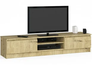 Obrzeża szafki zostały precyzyjnie oklejone specjalistyczną okleiną PCV 0,6 mm o zwiększonej odporności na ścieranie i wilgoć. Wnętrze mebla zostało zorganizowane w przemyślany i funkcjonalny sposób. Dwie pojemne, zamykane półki uporządkują domową filmotekę, dokumenty lub akcesoria. A w przestronnych dwóch półkach znajdzie się sporo miejsca na dekodery lub konsole. Szeroki blat posłuży jako podstawa na telewizor, sprzęt audio lub przestrzeń do eksponowania dekoracji.