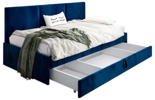 Miękkie welwetowe oparcie nie tylko chroni ścianę przed zabrudzeniami, ale sprawia, że sofa jest idealnym miejscem do relaksu w ciągu dnia. Komfort na zawołanie: Wieczorem wystarczy poduszka i kołdra, aby sofa stała się pełnowymiarowym łóżkiem, gotowym na noc pełną snów. Dyskretna praktyczność: Wysuwana szuflada na pościel to rozwiązanie dla tych, którzy cenią porządek i maksymalne wykorzystanie przestrzeni.