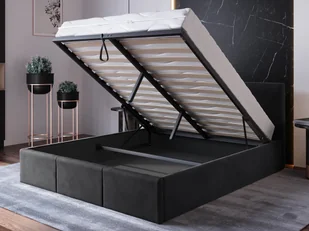 Wyposażone jest w podnoszony stelaż, który umożliwia łatwe dostęp do przestrzeni pod łóżkiem. Stelaż składa się z 2x14 listew umieszczonych na solidnej metalowej ramie z mocnymi podnośnikami gazowymi o mocy 80 N, zapewnia wyjątkowe wsparcie dla materaca i lekkie otwieranie pojemnika na pościel. To miejsce, w którym możesz przechowywać pościel, koce czy inne przedmioty, które chcesz trzymać poza zasięgiem wzroku. Ekskluzywny Design z Charakterem Kolor tkaniny welurowej nadaje łóżku niezwykłego charakteru. Pionowe przeszycia w zagłówku oraz w frontowym, niskim blacie, dodają mu unikalnego wyglądu.