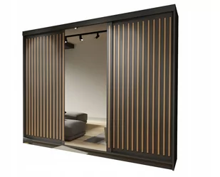SZAFA PRZESUWNA ROYAL 250 czarny / lamele wotan CECHY PRODUKTU: wysokogatunkowa płyta laminowana o grubości 16mm obrzeża zakończone okleiną ABS prowadnice al...