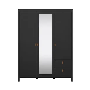 Szafa Madryt 199x150x59cm, 2 drzwi, 1 lustro, 2 szuflady w kolorze czarnym matowym. Szafa Madryt w matowym czarnym stylu łączy w sobie funkcjonalność i nowoczesny styl. Jest wyposażona w dwoje praktycznych drzwi, lustrzane drzwiczki, które ułatwiają szybkie przejrzenie stroju oraz dwie pojemne szuflady zapewniające dodatkowe miejsce do przechowywania. Szafka zapewnia dużo miejsca zarówno do przechowywania ubrań na drążku, jak i drobnych przedmiotów w szufladach. Dyskretne uchwyty i elegancki kolor sprawiają, że szafka jest ponadczasowym elementem pasującym do większości domowych wnętrz.