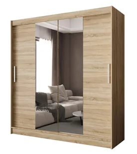 Materiały, które zapewniają trwałość na lata Solidna płyta meblowa – trwałość na lata i łatwość w utrzymaniu czystości. Wysokogatunkowe lustro podwójnie hartowane, wyróżniające się ponadprzecietną wytrzymałością. Wytrzymałe okucia, które zapewniają płynne przesuwanie drzwi nawet przy intensywnym użytkowaniu. Wymiary: szerokość: 180 cm, wysokość: