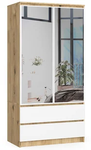 szafa wykonana z wysokiej jakości płyty meblowej zapewnia długotrwałość i wytrzymałość na codzienne użytkowanie. lewa strona szafy wyposażona w półki idealne na drobne akcesoria i odzież złożoną, prawa strona zawiera drążek na ubrania wiszące, co pozwala na efektywne zarządzanie przestrzenią. lustra umieszczone na obu drzwiach nie tylko ułatwiają codzienną toaletę, ale również optycznie powiększają przestrzeń, dodając elegancji i głębi pomieszczeniu. krawędzie szafy oklejone obrzeżem ABS, które zwiększa odporność na uszkodzenia mechaniczne, zapewniając szafie dłuższą żywotność. prosty, ale elegancki design szafy sprawia, że pasuje ona do różnorodnych wnętrz, od nowoczesnych po klasyczne, harmonizując z różnymi stylami dekoracji.