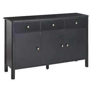 Nowoczesna komoda z szufladami. Nadaj swojemu wnętrzu elegancki wygląd i spraw, by twoja przestrzeń była dobrze zorganizowana dzięki tej stylowej szafce. Wykonana z wysokiej jakości płyty MDF w kolorze czarnym, wyposażona jest w drewniane nóżki i złote, postarzane gałki z metalu, które dodają jej odrobinę stylu retro. Dzięki pojemnym szafkom z półkami i szufladom, komoda sprawdzi się jako miejsce do przechowywania w salonie, jadalni lub przedpokoju. Szczegóły: Typ produktu: