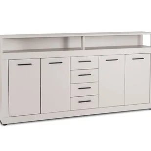 Komoda Blago o wymiarach 190 × 96 × 32 cm w kolorze kaszmir łączy pojemność z nowoczesnym stylem. Cztery szuflady na rolkowych prowadnicach oraz otwarte wnęki nad blatem zapewniają wygodne miejsce na ubrania, dokumenty czy dekoracje. Fronty z MDF w połączeniu z trwałym korpusem z MFC + HDF i obrzeżami ABS gwarantują odporność na codzienne użytkowanie. Ergonomiczne, metalowe uchwyty i stabilne plastikowe nóżki podkreślają funkcjonalność mebla, ułatwiając utrzymanie porządku w salonie, sypialni, przedpokoju czy gabinecie. Elegancka forma i praktyczne rozwiązania sprawiają, że Blago świetnie wpisuje się w nowoczesne wnętrza.