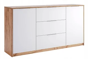 Wymiary: wysokość 85 cm, szerokość 160 cm, głębokość 40 cm Najważniejsze Informacje: Gwarancja: 10 lat (inni producenci oferują maksymalnie 24 miesiące gwarancji. Tylko u nas otrzymujesz pełną jakość potwierdzoną aż 10-letnią gwarancją). Kolor: dąb craft + biały . W naszej ofercie posiadamy także inne białe nowoczesne komody. Bardzo łatwy montaż (w zestawie znajduje się czytelna i dokładna instrukcja montażu mebla oraz wszystkie elementy montażowe).
