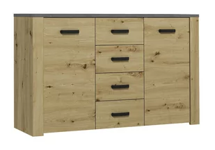 XL K2D4S - komoda 2-drzwiowa 4 szuflady Komoda dwudrzwiowa o szerokości 137 cm z czterema szufladami i dwiema półkami wykonana z płyty laminowanej odpornej na uszkodzenia. Kolorystyka to Dąb Artisan z widocznym usłojeniem w połączeniu z płytą Smooth Grey imitującą naturalny kamień. Wymiary: Szerokość (cm): 137 Wysokość (cm): 85 Głębokość (cm):