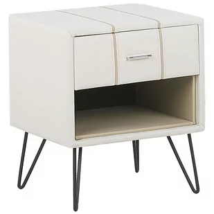 Tapicerowana szafka do sypialni Ta utrzymana w jasnej kolorystyce szafka, rozjaśni wizualnie sypialnie i sprawi, że będzie ona wyglądać czysto i przytulnie. Tapicerka ze sztucznej skóry wraz z metalowymi nóżkami sprawiają, że mebel ten wyróżnia się wśród aranżacji i pasuje doskonale do wnętrz nowoczesnych, jak i do stylu minimalistycznego. Praktyczna półka jak i szuflada, pomieszczą każdy drobiazg, książkę, telefon czy kosmetyki. Szafka nocna stanowi część kolekcji wraz z łóżkiem i ławką. Szczegóły: Kolor: Biały. Materiał: Skóra ekologiczna.