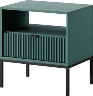 Stolik nocny NovaSzafka nocna w kolorze zielonym to doskonały wybór do nowoczesnej sypialni. Stolik nocny wyróżnia się na tle innych ponadczasową formą oraz podłużnymi frezowanymi frontami, które przyciągają uwagę. Szafka Nova została wyposażona w praktyczną pojemną szufladę oraz otwartą półkę pod blatem dając możliwość przechowywania akcesoriów i innych drobiazgów. Nowoczesna szafka nocna osadzona została na metalowych nóżkach. Wykonana z najwyższej jakości płyty laminowanej, która odporna jest na uszkodzenia mechaniczne.