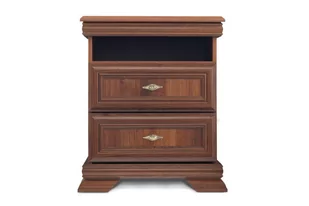 Piękny stolik nocny IMPERIO w stylu klasycznym IMPERIO Stolik nocny 58x68x40 cm | płyta wiórowa/listwy MDF | orzech Piękny stolik nocny reprezentuje styl Klasyczny, który łączy w sobie elegancję i ponadczasowość. Idealnie trafia nawet w najbardziej wyrafinowane gusta. Masywne meble, ciemny dekor oraz złote dodatki wniosą we wnętrze blask i elegancję. Cechy charakterystyczne Wybarwienie Orzech Konstrukcja Korpus wykonany z płyty wiórowej drewnopodobnej o grubości 16 mm, okleinowana folią Dekor i struktura płyty imituje lite drewno. Gruba płyta oraz specjalne mocowanie tylnej ścianki mebla gwarantuje jego stabilność.